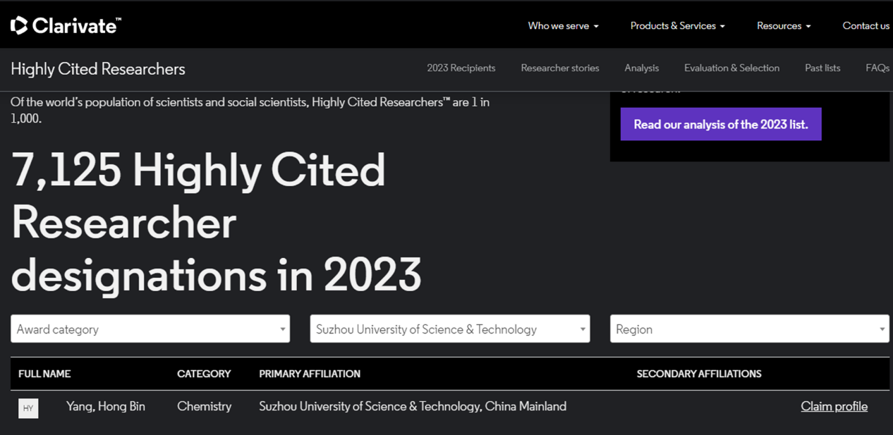 球探体育 杨鸿斌教授入选科睿唯安“高被引科学家”榜单