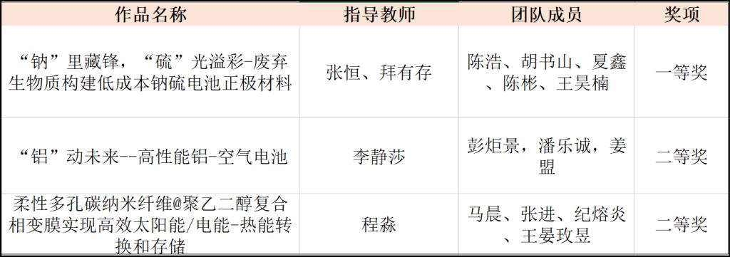 张恒、拜有存老师指导的作品《“钠”里藏锋,“硫”光溢彩-废弃生物质构建低成本钠硫电池正极材料》荣获一等奖。李静莎老师指导的作品《“铝”动未来--高性能铝-空气电池》和程淼老师指导的作品《柔性多孔碳纳米纤维@聚乙二醇复合相变膜实现高效太阳能/电能-热能转换和存储》荣获二等奖。
