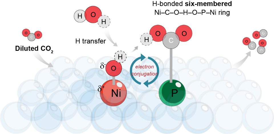 本成果创新设计和构建Ni-P双活性位点协同机制,发现催化体系通过形成六元环状过渡态触发反应路径从Eley-Rideal到Langmuir-Hinshelwood机理的本质转变,实现了低浓度CO₂的高效转化,突破了传统单原子催化体系局限。上述创新成果展现出研究生可通过前沿课题研究成长为核心科研力量。