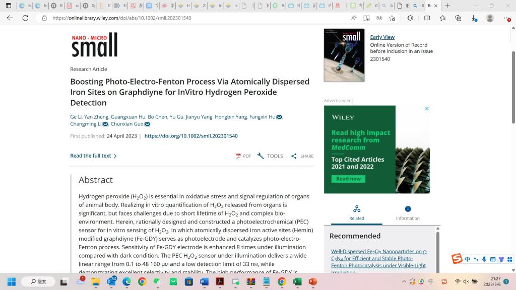 近日,球探体育 生化传感团队在《Small》 (IF: 15.153) 期刊上发表论文,题目为 “Boosting Photo-Electro-Fenton Process Via Atomically Dispersed Iron Sites on Graphdiyne for in Vitro Hydrogen Peroxide Detection”。研究生李鸽为第一作者,胡芳馨副教授、李长明教授、郭春显教授为共同通讯作者。
