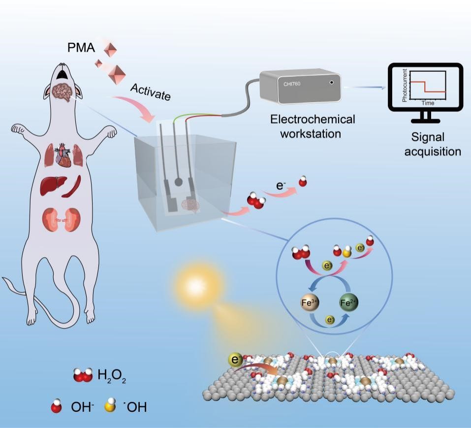 该工作设计和构筑了一种铁单活性位点分散的仿生催化剂(Fe-GDY),其作为光电极有效增强了光-电芬顿反应。基于上述独特的物化特性,仿生催化剂Fe-GDY被用于构建了光电化学传感器,对生物信号分子H2O2展现了高灵敏、快响应和选择性。结合高分辨直流体打印技术,仿生催化剂Fe-GDY也被用于制备了柔性传感器件,实现对小鼠多种器官释放H2O2生物信号分子的原位灵敏检测。