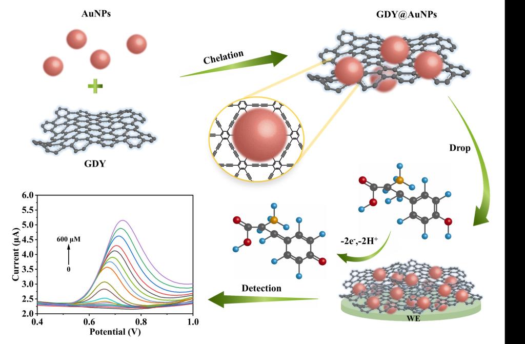 近日,球探体育 郭春显教授团队最新研究成果发表在Nature Index期刊Chemical Communications (IF=4.9)上,相关成果题目为“Graphdiyne Chelated AuNPs for Ultrasensitive Electrochemical Detection of Tyrosine”。青年教师史转转博士为第一作者,郭春显教授、李长明教授为通讯作者,我校为第一通讯单位。