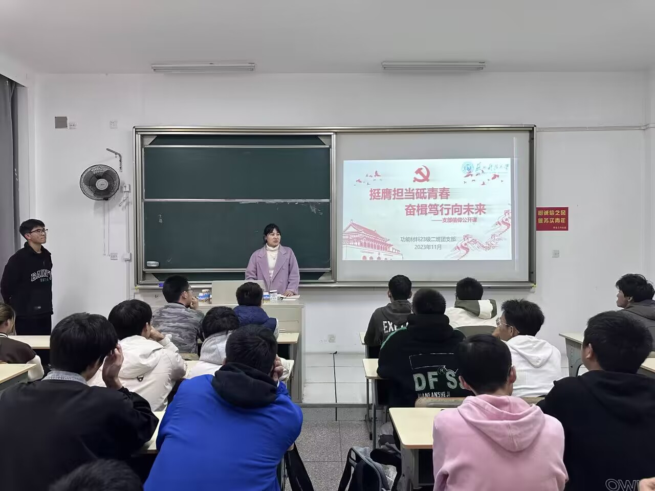 于2023年11月22日下午,功能材料2312班级在石七205教室举办了“挺膺担当”主题团课,此次团课由团支书叶健龙同学主持,全班同学参加。在此次团课中,着重强调了青年一代的担当使命,并对所有同学做出了担当使命的号召!