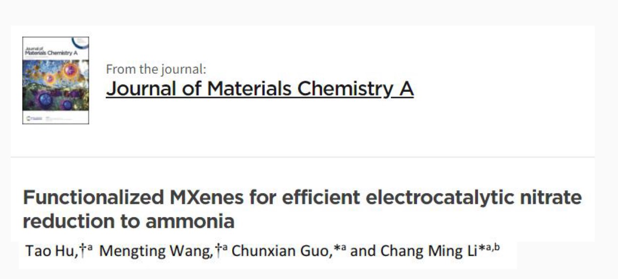 Tao Hu, Meng Ting Wang, Chun Xian Guo*, and Chang Ming Li*. "Functionalized MXenes for Efficient Electrocatalytic Nitrate Reduction to Ammonia." Journal of Materials Chemistry A (2022): 2050-7488. 文献链接://dx.doi.org/10.1039/d2ta00470d.