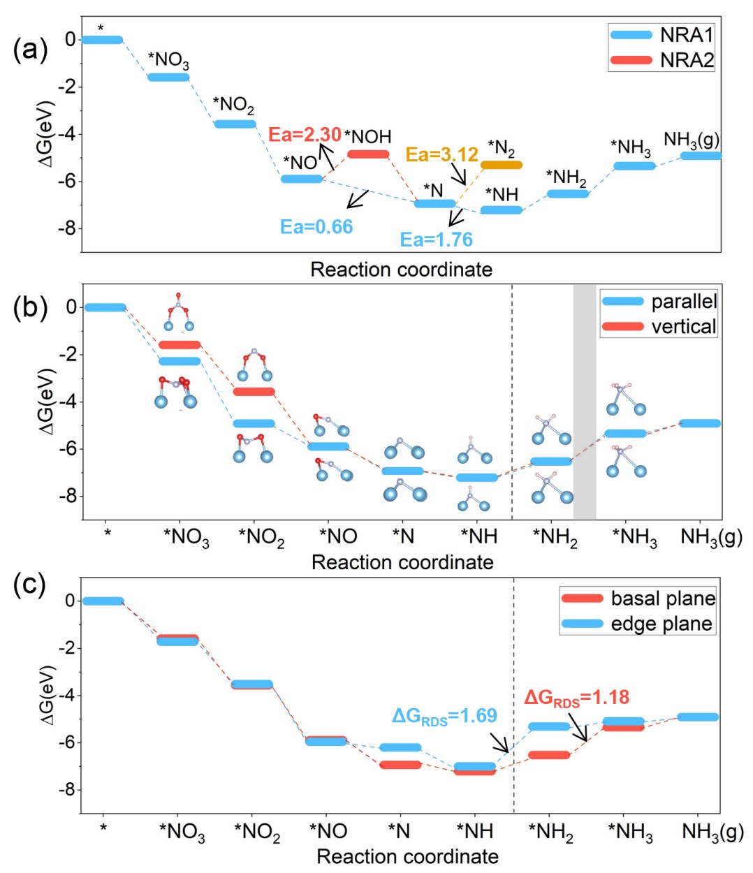 本文利用基于密度泛函理论的第一性原理计算方法,筛选了MXene基电化学还原为氨的电催化材料,综合考虑了原始、金属掺杂和官能化的MXene材料,吉布斯自由能图和活化能用于判定反应路径,并通过电荷转移、电子结构分析揭示官能化MXene的NRA活性来源,系统探讨了8种M3C2(M=Ti、V、Cr、Nb、Mo、Zr、Ta、Hf)MXene对硝酸盐还原制氨反应的催化性能,同时讨论了包括基面和截面在内的活性位点。结果表明,MXene的基面是主要的催化表面,NO3-在MXene上更易垂直吸附。对于M3C2 MXene基材料表面的NRA反应,脱氧过程容易发生,加氢过程比较困难,因此加氢过程为速率决定步骤。所有原始状态的M3C2 MXene由于良好的HER性能不适合作NRA催化剂。经过官能化,Ti3C2 MXene及过渡金属掺杂的Ti3C2 MXene可以有效抑制HER,提高催化活性。