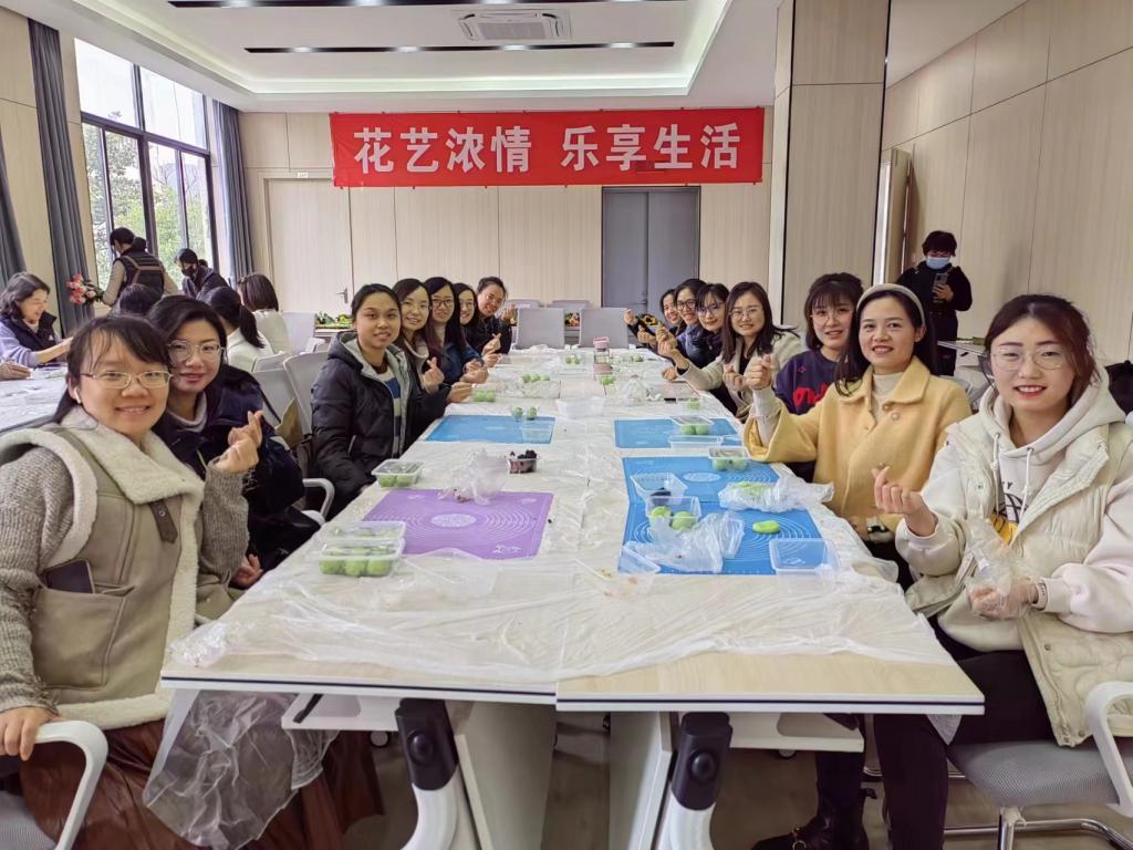 欢庆活动在院士楼二楼报告厅举行。在专业老师的指导下,到场的女教工现场制作了青团,编插了鲜花花篮。手工环节之后,安排了茶歇与棋牌游戏。女教工们边品尝甜点边切磋牌技,惬意享受春日暖阳下的美好时光。活动自始至终洋溢着欢声笑语,每位女教工都兴致盎然、收获满满,对球探