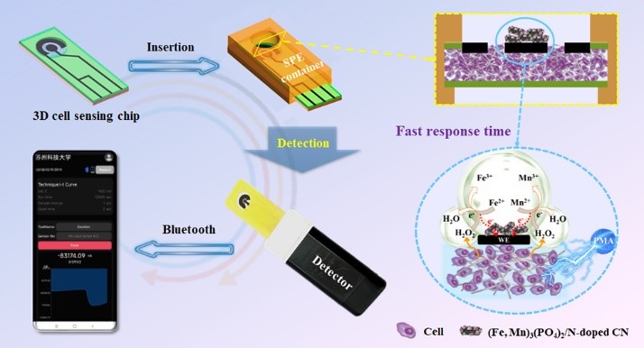 即时检验设备(point-of-care testing, POCT)具有快速、便携、实时监测等突出优点,成为临床诊断、便捷居家式检测的生物医学检测设备,但传统的POCT制造工艺复杂,成本高,阻碍了其批量生产和广泛应用。针对上述问题,基于前期的工作基础,我们设计和构建了一种新型、低成本的集成式三明治纸基三维细胞POCT电化学传感装置,可用于原位和无线监测活细胞释放的活性氧分子。该纸基POCT装置创新性地将细胞三维培养与检测同步集成在纸纤维上,显著缩短了目标分子到达传感电极的扩散距离,响应时间低至0.2 s,为低成本、高灵敏的POCT设备在临床诊断和便捷居家式医疗中的应用提供了有力支撑。