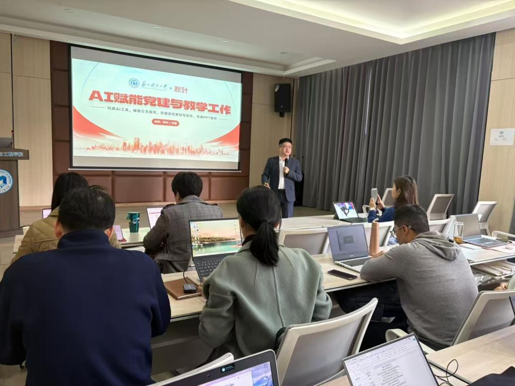 朱超围绕AI赋能党建与教学工作,深入讲解了如何利用人工智能技术提升党建工作效率与创新教学模式,促进本部门事业发展。他详细介绍了各个AI工具,展示了丰富的案例,并指导教职工现场开展了实操训练。